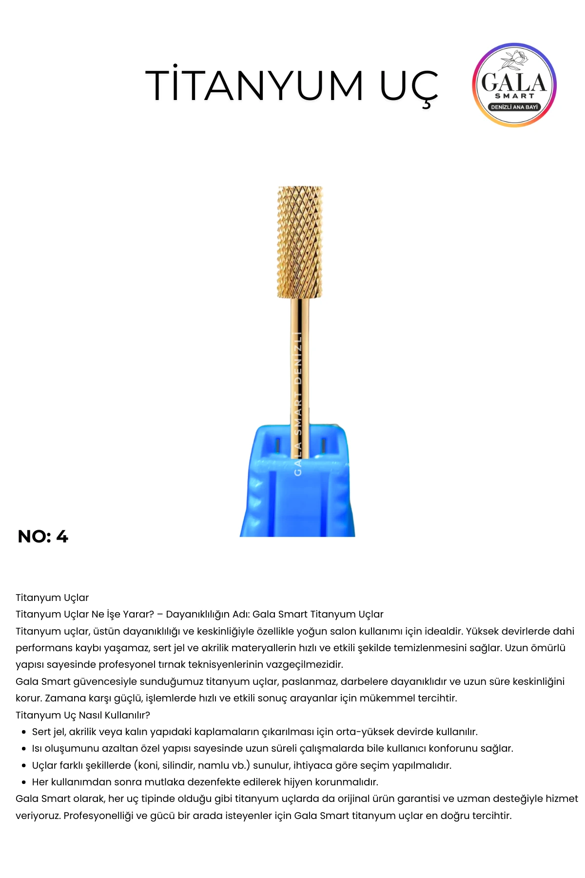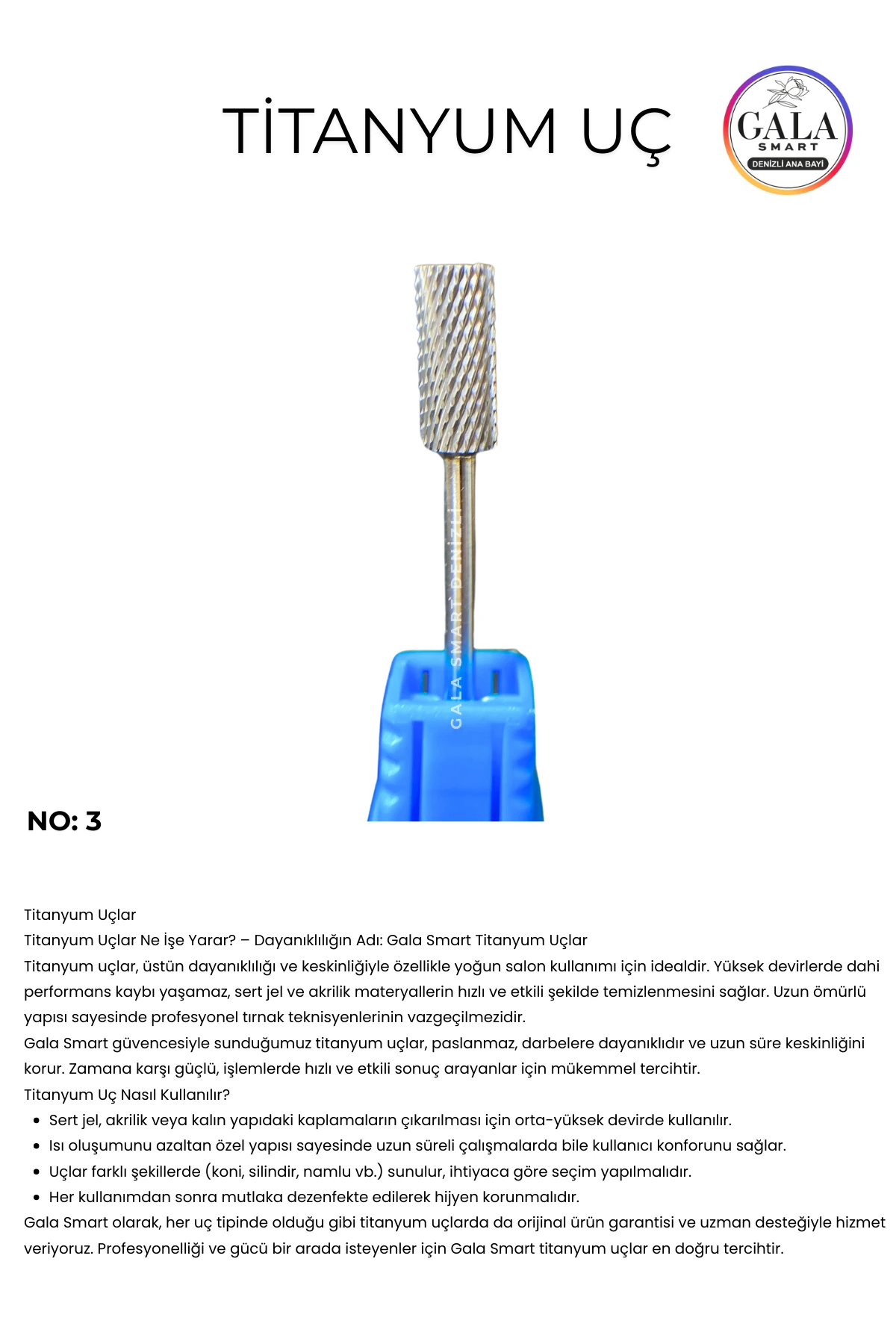 İşlem sonunda parlaklık verir. Gala Smart bakım yağı ile tırnak etlerine düşük devirde masaj yapılabilir.